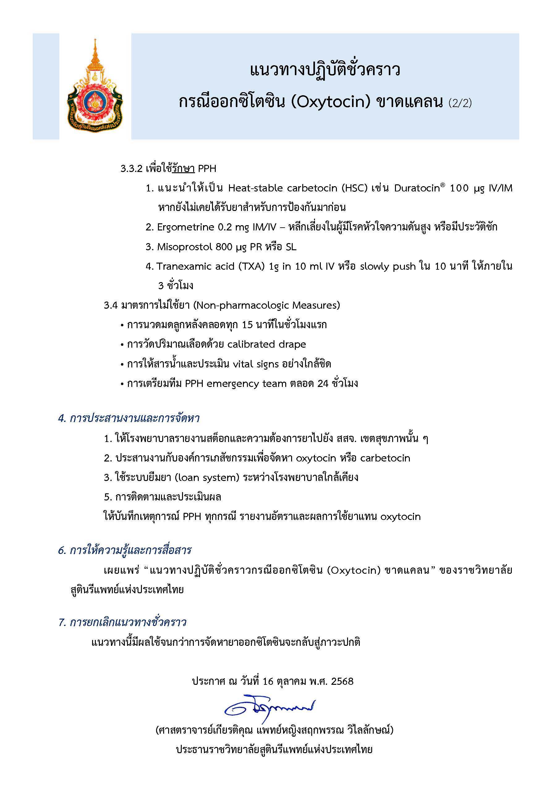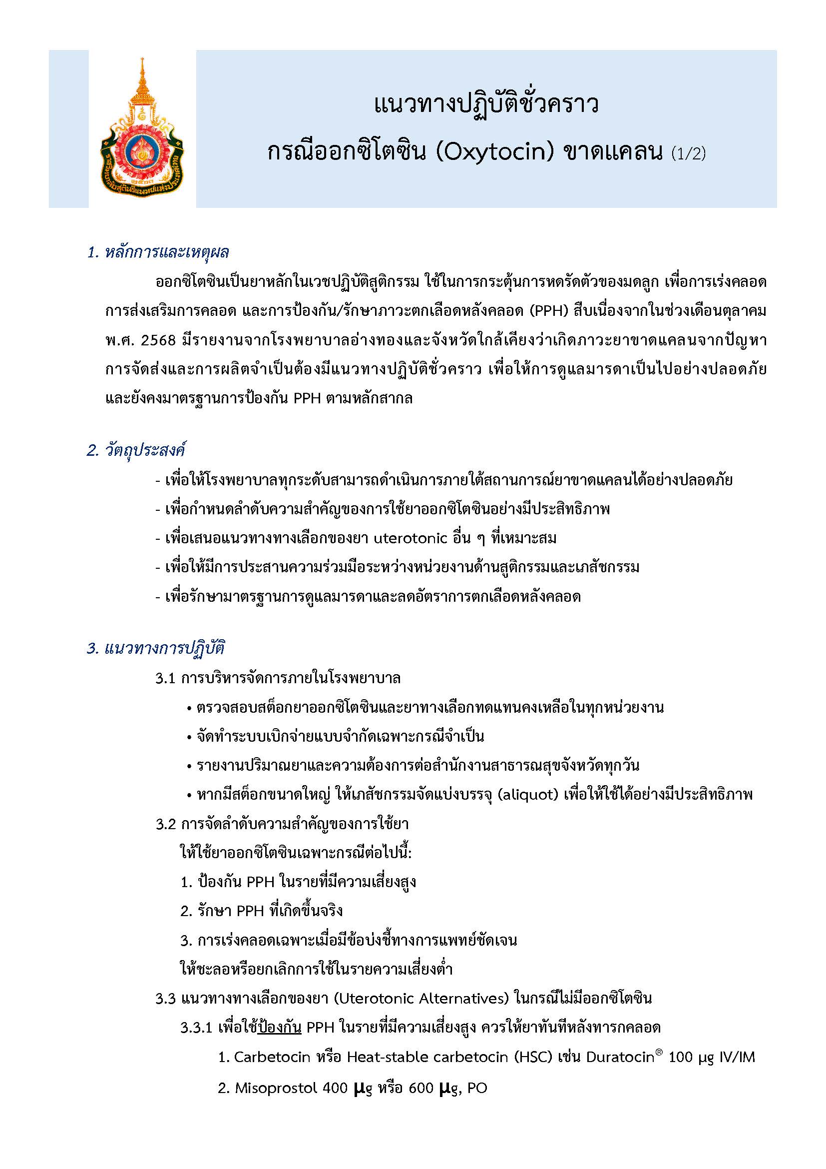 แนวทางปฏิบัติชั่วคราวกรณีออกซิโตซิน (Oxytocin) ขาดแคลน
