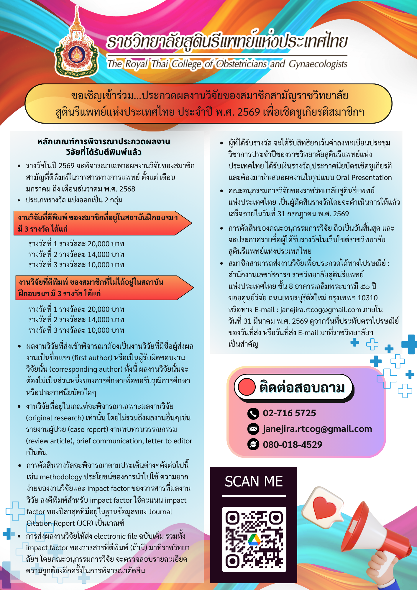 เชิญชวนเข้าร่วม ประกวดผลงานวิจัยของสมาชิกสามัญราชวิทยาสูตินรีแพทย์แห่งประเทศไทย พ.ศ. 2569 เพื่อเชิดชูเกียรติสมาชิกฯ