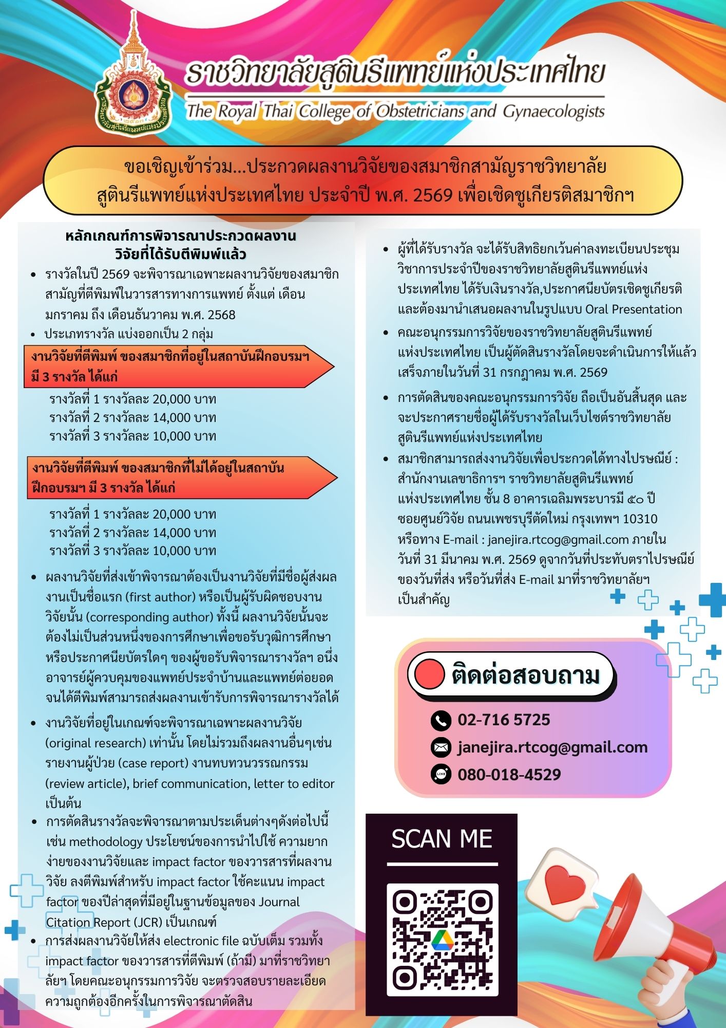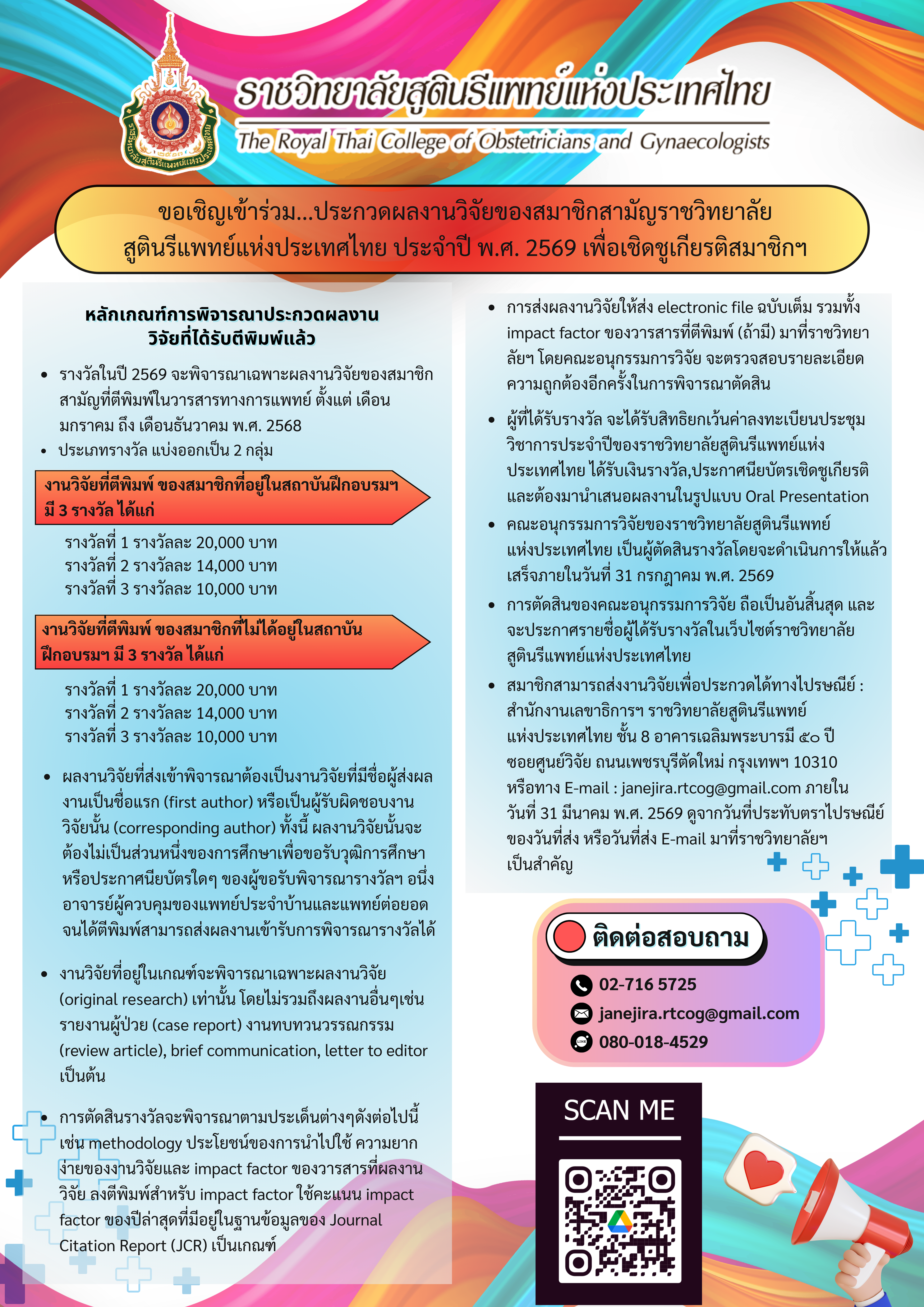 ราชวิทยาลัยสูตินรีแพทย์แห่งประเทศไทยขอเชิญชวนเข้าร่วมประกวดผลงานวิจัยของสมาชิกสามัญ ประจำปี พ.ศ. 2568เพื่อเชิดชูเกียรติสมาชิกฯ